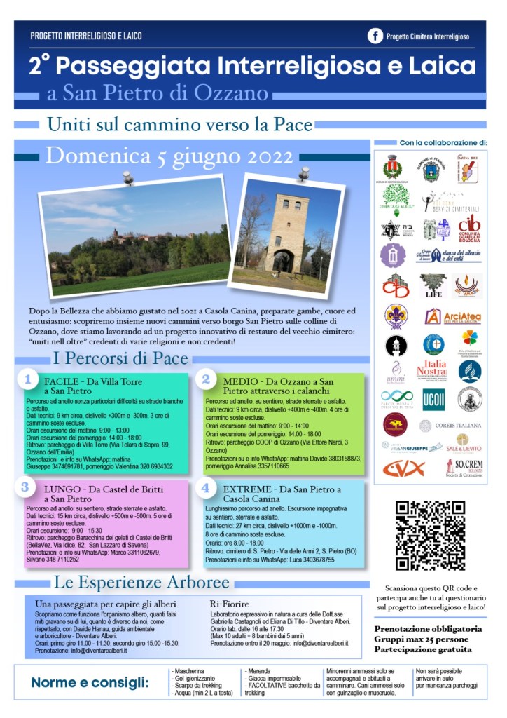 • 5 maggio 2022: seconda camminata interreligiosa e laica per i sentieri del Parco dei Gessi. Viene percorso anche l’itinerario di 25 km che unisce il cimitero di Casola Canina con quello di Borgo San Pietro. Partecipano circa 200 persone, tra cui i proff. Ugolini e Piva con i loro studenti universitari che si apprestano a conoscere il territorio: